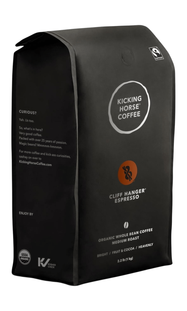 Kicking Horse Cliff Hanger focuses on organic sourcing and a balanced roast profile. It aims for a smoother, more refined espresso without pushing too far into dark roast bitterness.